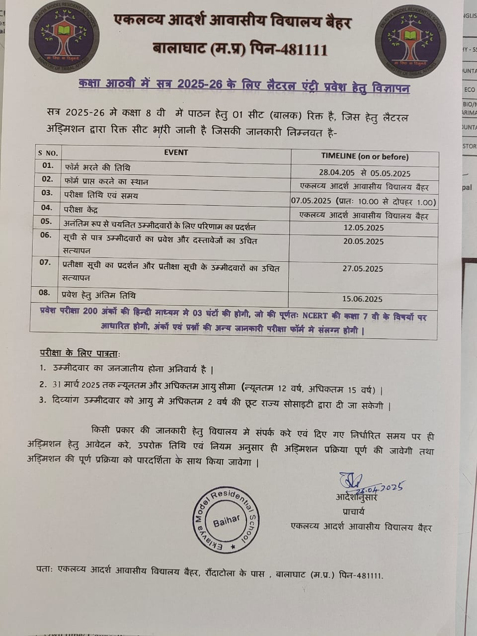 Eklavya Model Residential School (EMRS) Baihar, District Balaghat (M.P.), is a premier educational institution dedicated to the empowerment of Scheduled Tribe (ST) students. Established as part of the national initiative to provide quality residential education to tribal children, the school ensures holistic development through academic excellence, cultural enrichment, and overall personality growth.